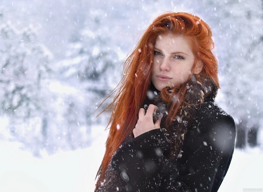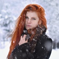 a dark coat, which suggests it might be cold or snowy outside. Her gaze is directed off to the side, and she appears contemplative or introspective. The background is blurred but looks like snow falling or accumulating on what could be