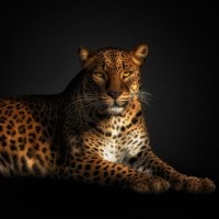 an impression of alertness or curiosity. The background is dark, which contrasts sharply with the leopard's fur, making it stand out as