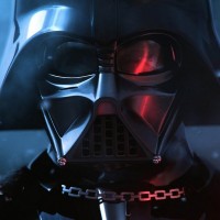 The image features the character Darth Vader from the Star Wars franchise. He is depicted with his iconic black armor, red glowing eyes, and a mechanical respirator. His expression is intense and he is looking directly at the camera.