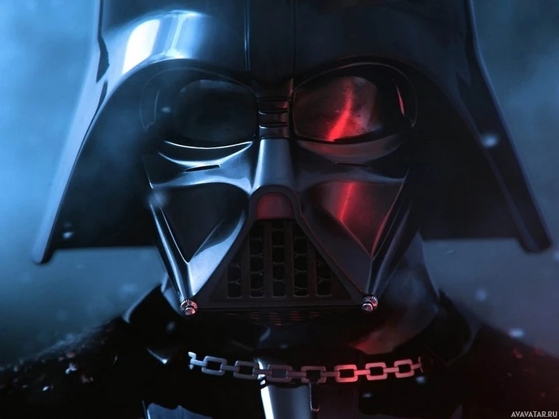 На картинке изображен персонаж Дарт Вейдер из франшизы «Звездные войны». Он изображен со своей культовой черной броней, красными светящимися глазами и механическим респиратором. Его выражение интенсивное, и он смотрит прямо в камеру.