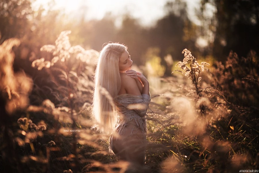 tall grass or reeds around her. The lighting suggests it might be either