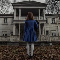 a dark dress and white socks, which stand out against the muted colors of the surroundings. They seem to be observing something inside the house or perhaps simply admiring