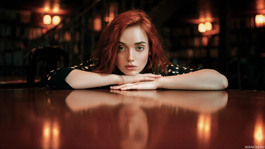 red hair and bangs, posing with her chin on the edge of what appears to be a wooden table. She has