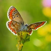 The picture features a small butterfly perched on a flower. The butterfly has vibrant wings with orange and black spots, which is characteristic of some species like the Orange-tip Butterfly (Anthocera coelestina). It appears to be enjoying the nectar from the flower it's sitting on.
