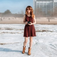 red hair, wearing a maroon dress and brown boots. She is standing on what appears to be