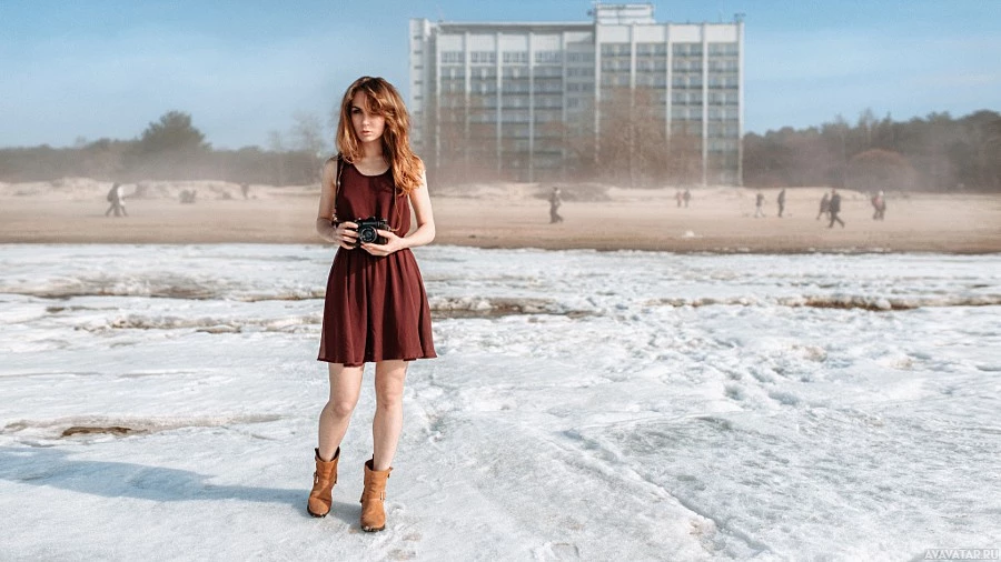 a frozen body of water or snow-covered ground, as indicated by the presence of ice chunks around her. In the background, there's a building that could be part of a resort or similar establishment, and other people can also be seen at a distance. The woman is holding a camera, suggesting she might be capturing photos for personal or professional reasons.