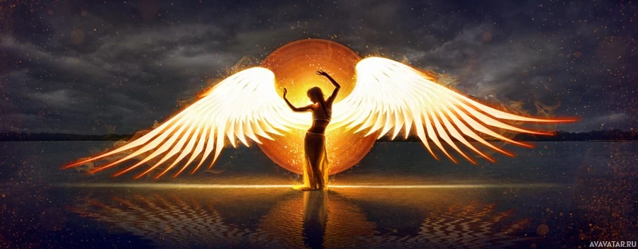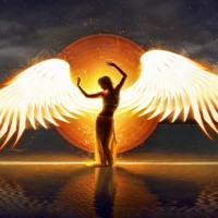 an angelic figure. The central focus is on the wings, which are spread out behind the character, suggesting movement or flight. In the foreground, there appears to be a person in silhouette, standing at