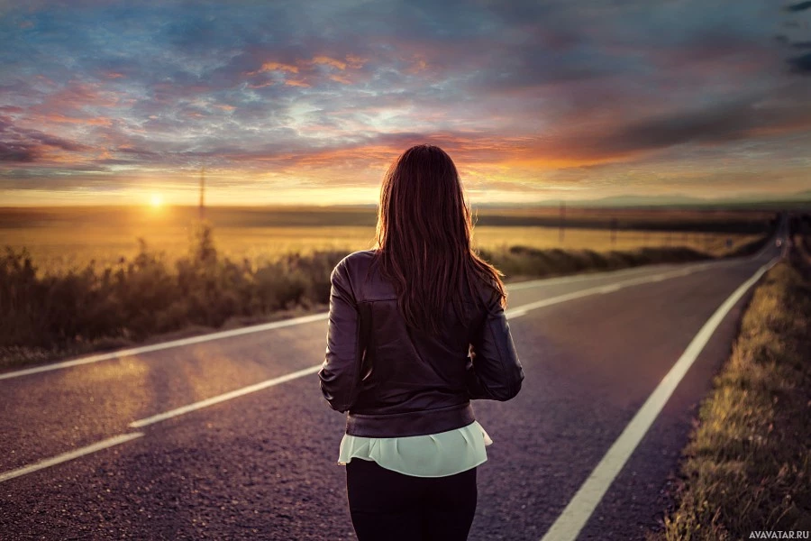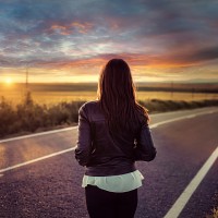 The image depicts a person, specifically a woman, standing alone on what appears to be a rural road during either sunrise or sunset, given
