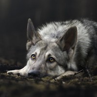 The image shows a wolf lying on the ground. It appears to be in a natural, possibly