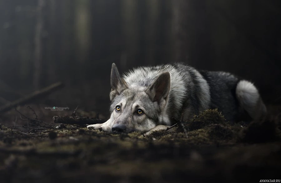 wooded environment with muted lighting that suggests it might be either dawn or dusk. The wolf is looking directly at the camera, which creates