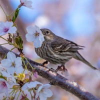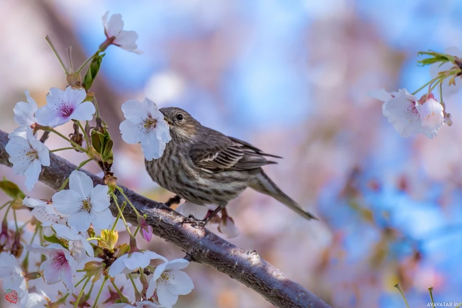 На картинке изображена маленькая птица, широко известная как воробей, сидящая на ветвях дерева в полном расцвете с вишневыми цветами. Птица находится в фокусе, в то время как фон имеет мягкофокусную вишню, цветущую на ясном небе. Эта сцена отражает суть весны в регионах, где таких деревьев в изобилии.