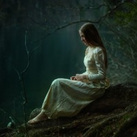 a thoughtful gaze. The setting is serene, with the surrounding forest providing a natural backdrop that is lit with a soft,