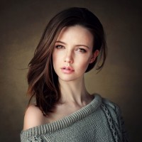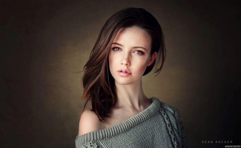a cozy sweater. Her eyes are looking directly at the viewer, and there's