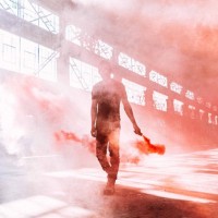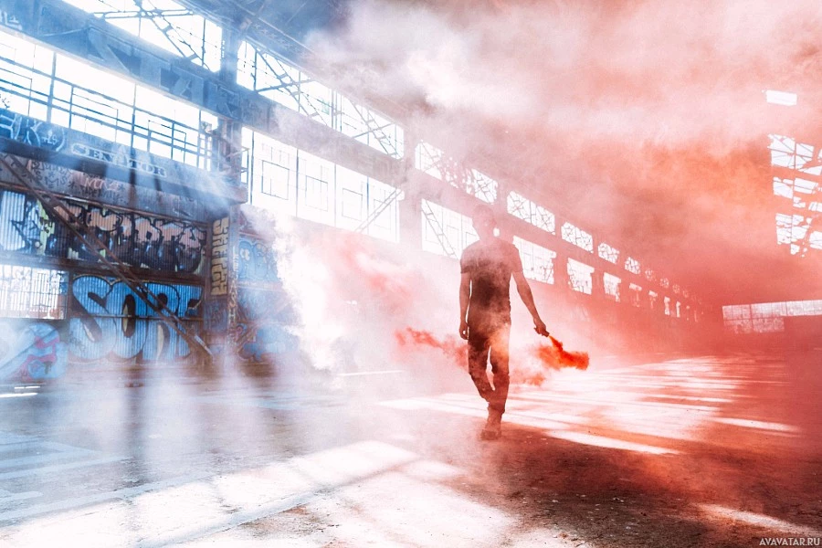 an indoor space with industrial elements, possibly a warehouse or a workshop given the presence of what looks like machinery or structures in the background. The use of red smoke adds a vibrant contrast to the otherwise