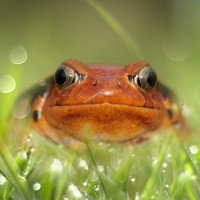 На картине изображена лягушка, а именно тип красноглазой древесной лягушки, выглядывающей из травы. Он находится в естественной среде и, вероятно, отдыхает или наблюдает за окружающим миром.