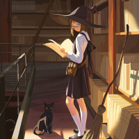 an animated character who appears to be a witch or wizard, reading a book. She is wearing