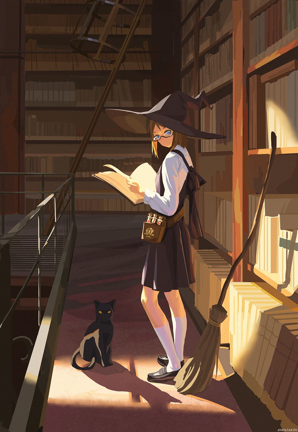 a witch hat and has a broomstick leaning against the wall beside her. There's also a cat standing near her, looking at something in her direction with its ears perked up. The setting seems to be