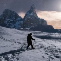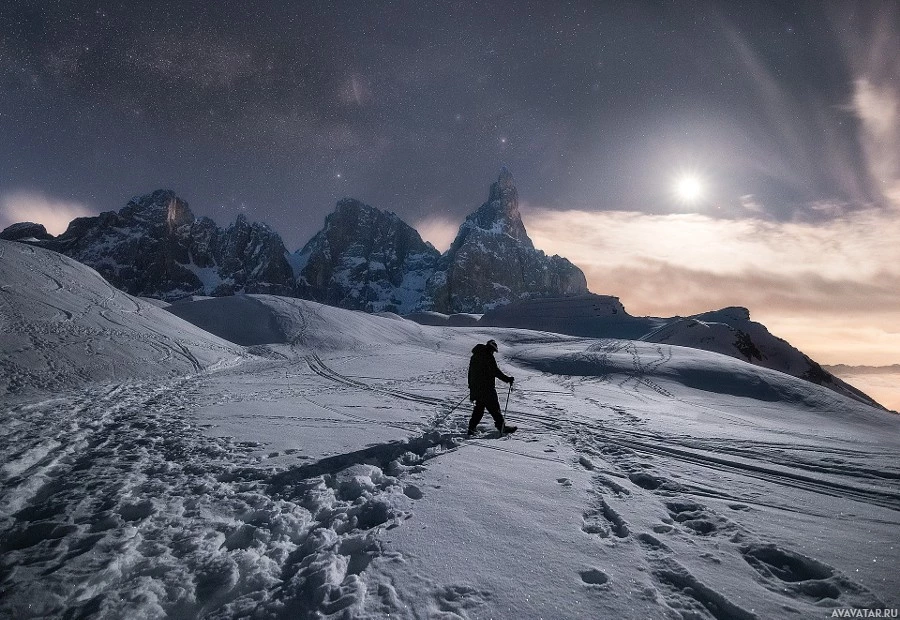 the night sky, trekking through a snow-covered landscape. It appears to be taken at night given