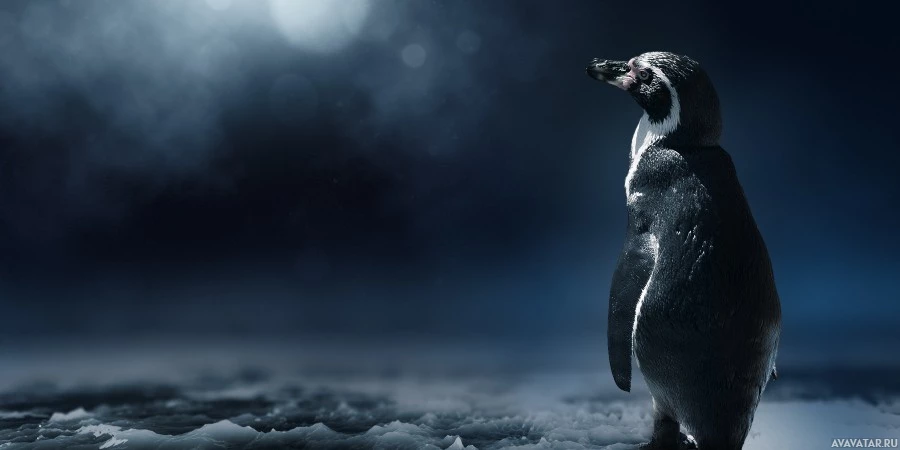На картинке изображен пингвин, стоящий на ледяной льдине ночью. Это цифровая иллюстрация, которая отражает сущность одинокого пингвина в драматичной и несколько мрачной обстановке, возможно, указывая на чувство изоляции или одиночества.