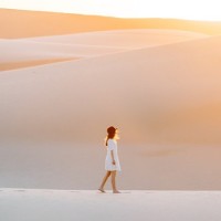 a young girl, walking across a sandy desert landscape. The sunlight casts long shadows and illuminates the scene with a warm glow, suggesting either