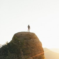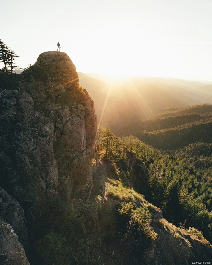 a silhouette of a person standing on the edge of a cliff or mountain ledge. They are looking out over a scenic landscape, which appears to be at either sunrise or sunset, given