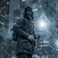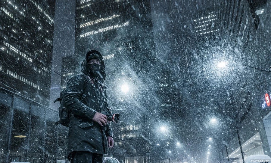 the middle of a snowstorm at night. The individual is wearing a hooded coat, and they have a camera in their hands, suggesting they might be taking photographs despite the harsh