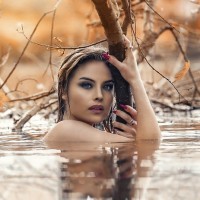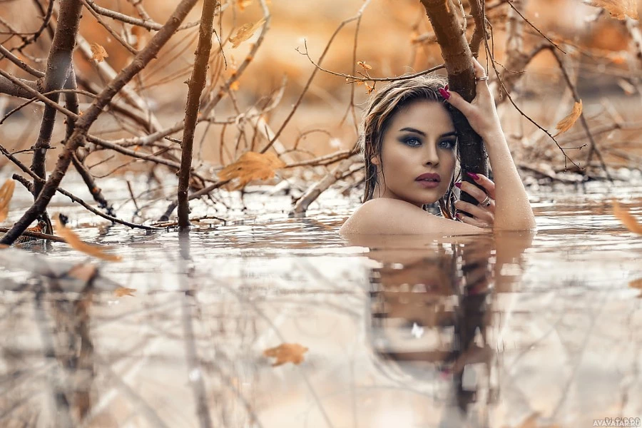 The image features a woman partially submerged in water, likely from flooding or a shallow
