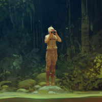 traditional clothing, standing at the edge of a small pond or stream surrounded by moss and ferns. This figure is holding a large