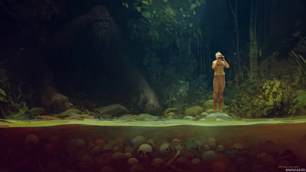 a humanoid creature with a furry appearance, resembling a Sasquatch, standing in the background behind the man. The overall atmosphere suggests a scene from a fantasy or