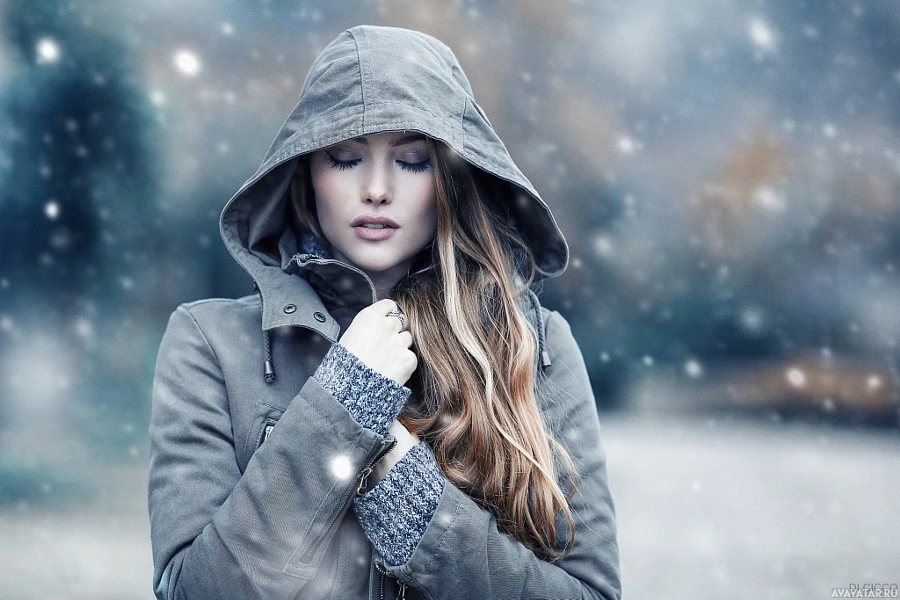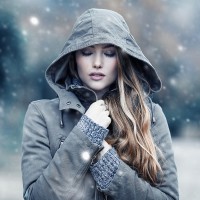 a gray coat, and her hands are tucked into the pockets of the coat. The woman appears to be in a contemplative or thoughtful pose, looking away from the camera. There's a suggestion of snowy weather indicated by the overcast sky and the hint of
