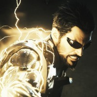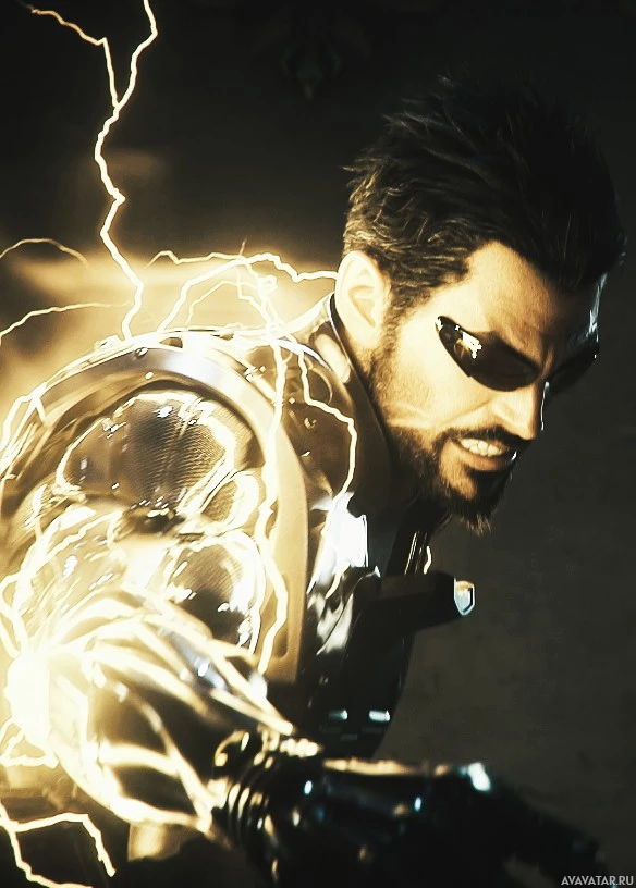 the video game Deus Ex, recognizable by his distinctive armor and cybernetic enhancements. He has a beard and mustache, and is wearing sunglasses, giving him a rugged and intense appearance. The character is also emitting