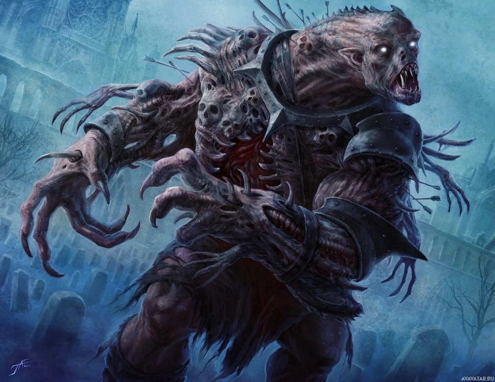 dark substance, which adds to its ominous appearance. In the background, there are gothic architectural elements, such as arches and pillars, suggesting this scene might take place in a medieval or otherworldly setting. The color palette consists of cool tones like blues and greens, contributing to a dark and