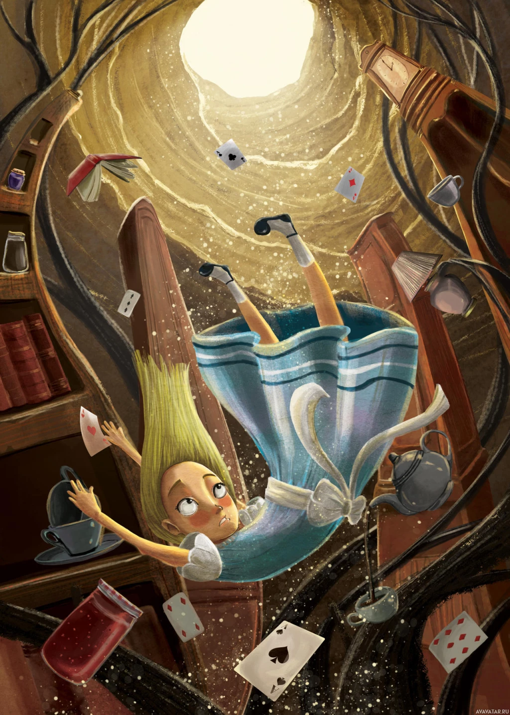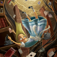 playing cards, all of which seem to be swirling around them, creating an impression of chaos or whimsy. The setting appears to be inside a tree-like structure, with roots and branches forming the framework. The background is filled with moonlit darkness, which adds to