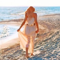 a white dress that flows as she walks, creating a graceful motion. The view is from behind, showing her back as she strides away from the camera along the shoreline. There are no other