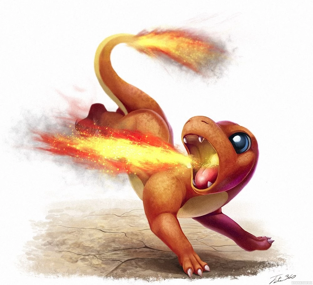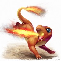 an animated character that appears to be a Charmander, which is a type of Pokémon. The Charmander is depicted with flames coming out of its mouth, possibly indicating the ability it has to breathe fire in the game and television series. The background suggests a desert-like environment, which is typical for some of