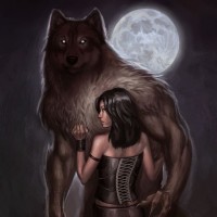 a fantasy scene with a werewolf and a girl. The werewolf is in the foreground, standing on all fours, showing its wolf-like features such as