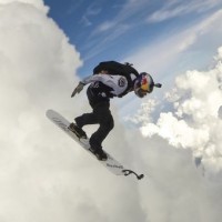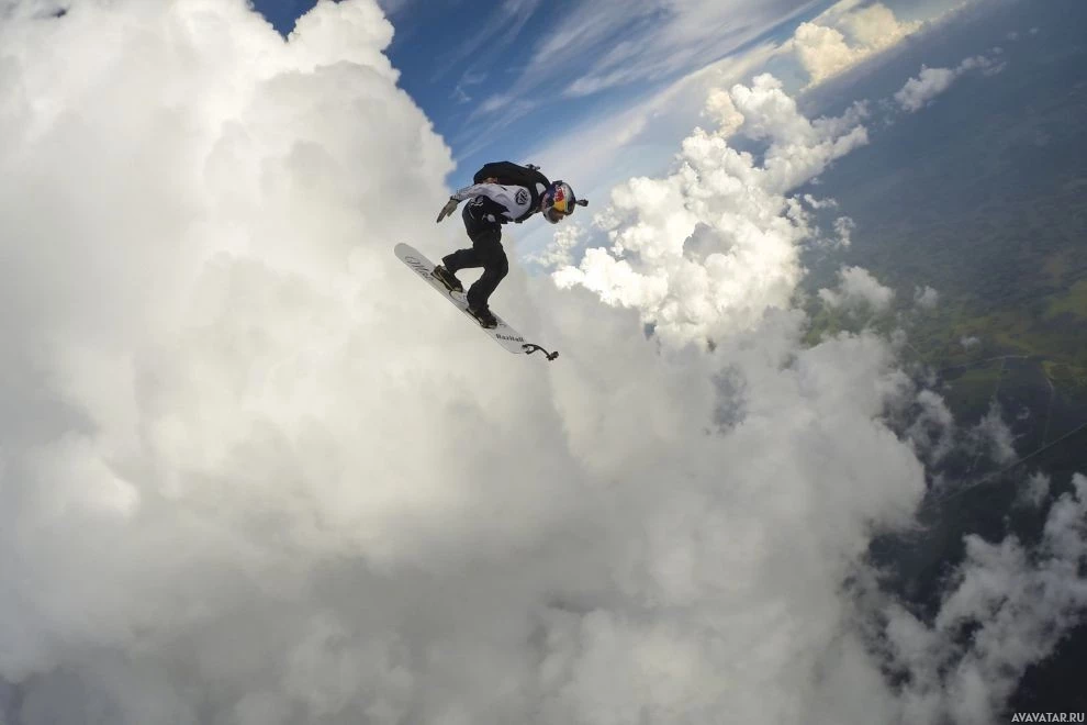 The image shows an individual performing a high-altitude skydiving maneuver. The person is wearing a harness and has their arms spread out for balance, while riding a snowboard that is positioned vertically in the air. This scene is set against a backdrop of fluffy clouds with