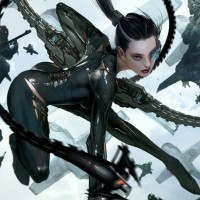 dark hair and is wearing a black bodysuit with a design that suggests she might have some sort of special abilities or armor. The setting seems to be a chaotic battlefield with multiple flying vehicles, possibly aircraft or ships, indicating that the character may be involved in combat or