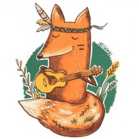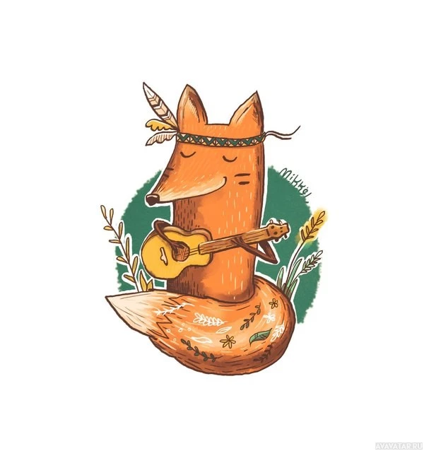 The image shows an illustration of a fox playing the guitar. The fox is anthropomorphized with human-like features such as holding the guitar with its
