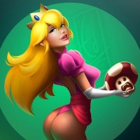 Princess Peach from the video game franchise Super Mario. She is shown in an artistic and stylized manner, which often occurs with fan-made images or parody creations. In her hand, she holds the iconic mushroom, a power-up