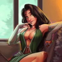 a green dress that has a design reminiscent of armor, suggesting she might be a warrior or fighter type in her context. The setting includes what looks like a cozy room with a window and a fruit bowl on a table beside her, indicating