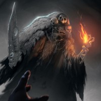 fantasy scene with a figure that appears to be a malevolent entity or creature, possibly reminiscent of the Dark Souls series. This character is holding what looks like