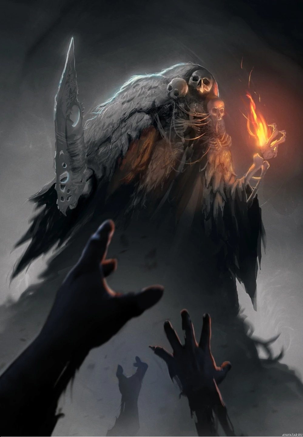 a flaming torch in one hand and is casting an ominous shadow over a group of figures below. The characters at the bottom seem to be reaching out towards the figure above them, which suggests they are either summoning or pleading with the creature. The setting appears to be set in a bleak,