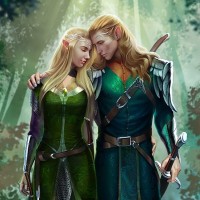 elven attire with green tones, while the character on the right has a more armored appearance, suggesting they might be a warrior or protector of some sort. They are embracing each other, and their expressions convey affection and love.