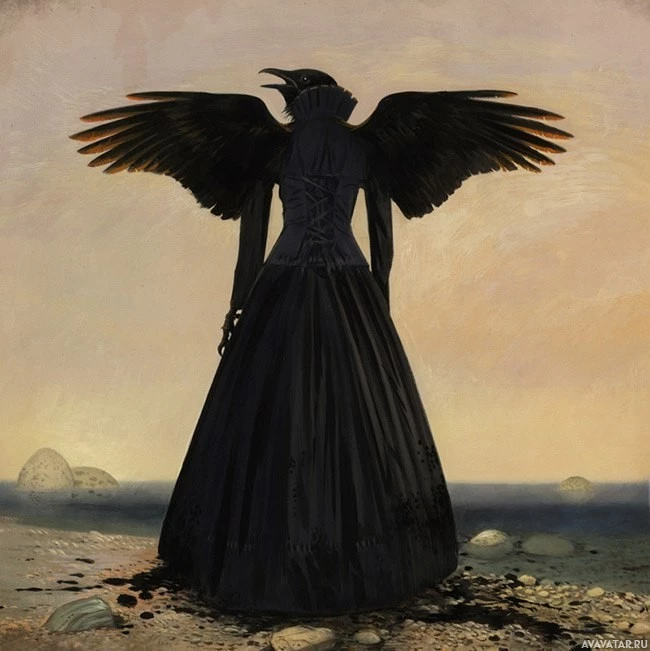 sky with clouds that suggest either sunrise or sunset. There are no birds directly visible in this image; however, the wings on the figure's back could be associated with birds, given the context of crow-like characteristics. The overall atmosphere is serene and somewhat eerie due to the combination of the character's wings,