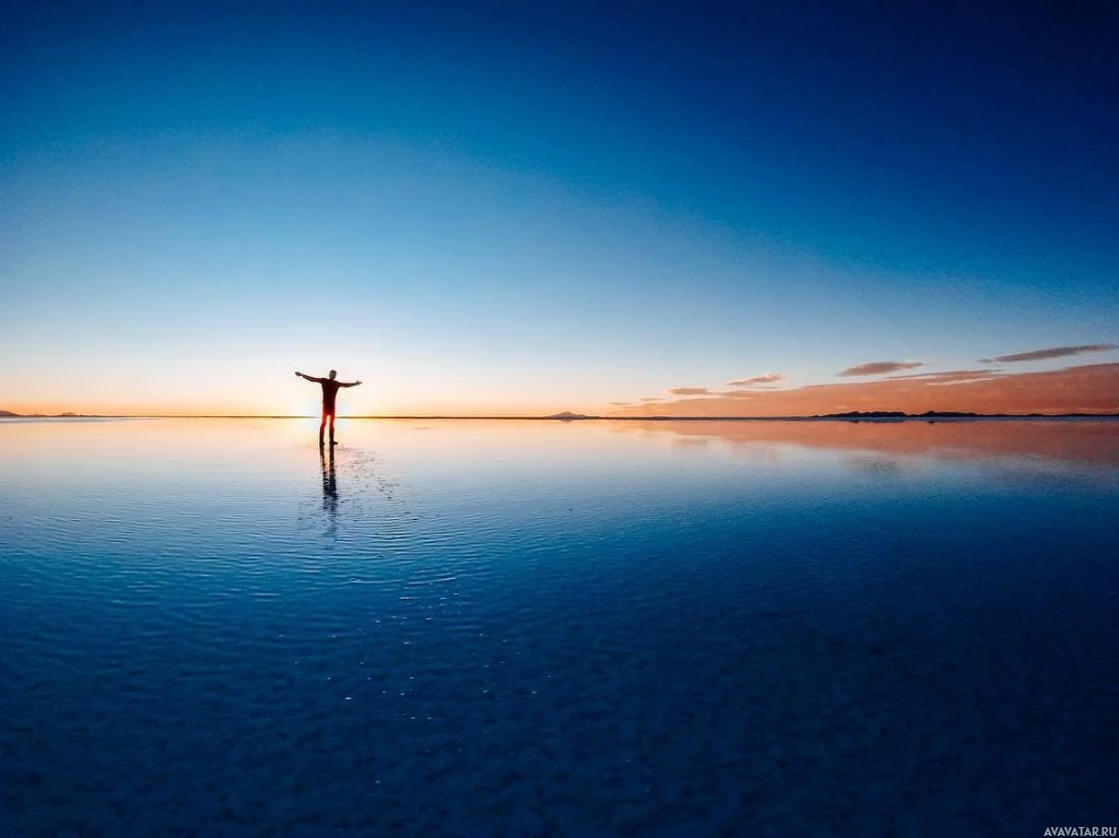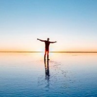a body of water during what appears to be sunset or twilight. The individual is facing towards the horizon, with their arms raised as if in celebration or embracing the moment. There's a reflection of the sky and the surrounding environment on