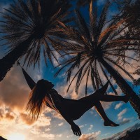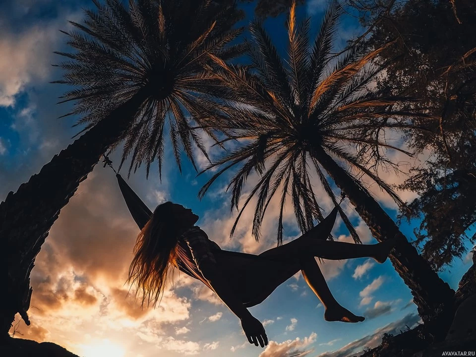a silhouette of a girl suspended from a hammock with her arms outstretched, creating a sense of motion as if she is swinging or dancing. She appears to be looking up at the sky, which has clouds and possibly