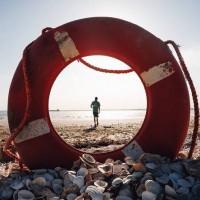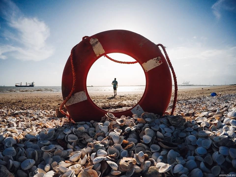 На картинке изображен человек, идущий по пляжу на закате. На переднем плане находится открытый спасательный круг, лежащий на песчаной местности с разбросанной вокруг него галькой. Небо ясно с оттенками оранжевого и синего от заходящего на заднем плане солнца. Также на расстоянии видна лодка на воде. Общая атмосфера предполагает спокойную пляжную сцену в конце дня.