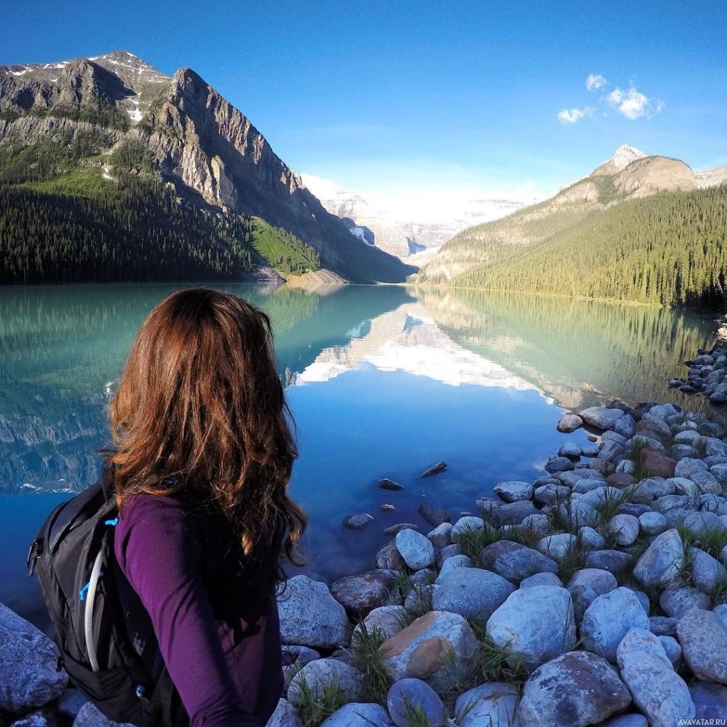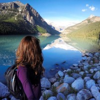a mountainous landscape with lush greenery, indicative of a wilderness area like Banff National Park in Canada. There's