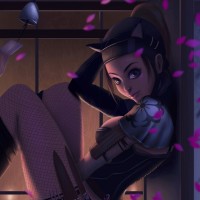 pink petals scattered around, possibly indicating that she is emerging from a sealed area or that the battle has just concluded. Her pose and expression convey confidence and readiness. The style of the illustration is detailed and vibrant, with a focus on realistic